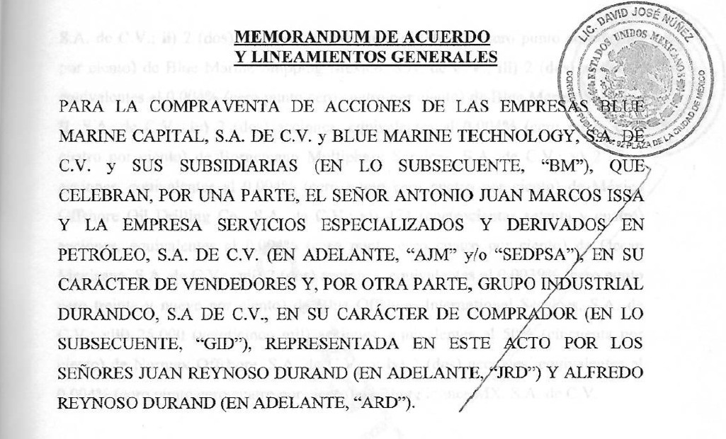 De acuerdo a documentos notariados en poder de Código Magenta, en noviembre de 2018, Antonio Juan Marcos Issa vendió las acciones de Blue Marine Capital SA e CV, Blue Marine Technology SA de CV y sus subsidiarias a Grupo Industrial Durandco. La transacción se llevó a cabo dos semanas antes de que iniciara el sexenio de Andres Manuel Lopez Obrador.