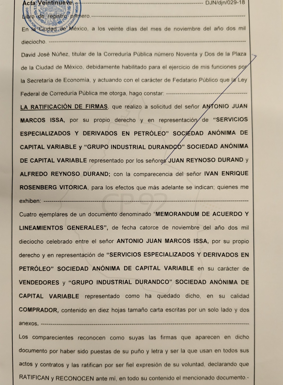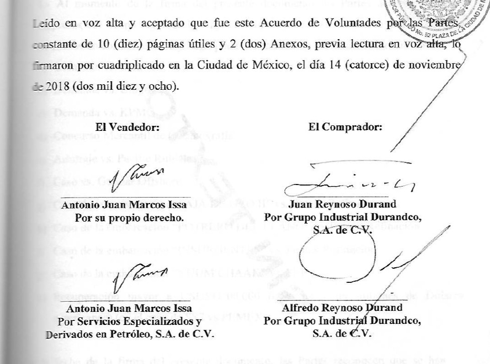 En 2018, el empresario coahuilense Antonio Juan Marcos Issa vendió sus acciones de la compañía que recibió de Pemex un contrato irregular de 15 mmdp