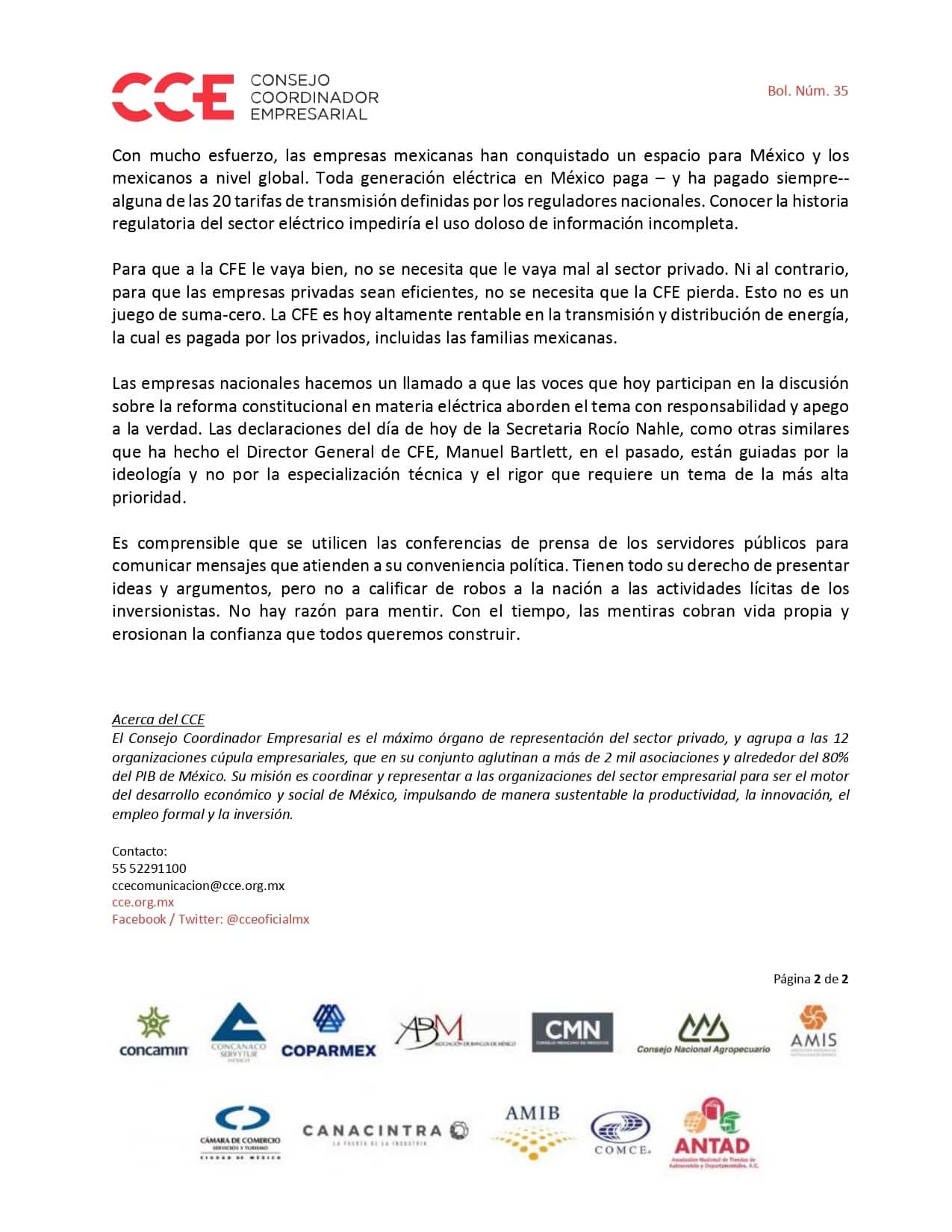 El máximo órgano de representación del sector privado sostiene que la secretaria de Energía y el director de la CFE, Manuel Bartlett, han incurrido en falsedades para promover la reforma más radical del sexenio de Andrés Manuel López Obrador: “están guiados por la ideología y no por la especialización técnica”