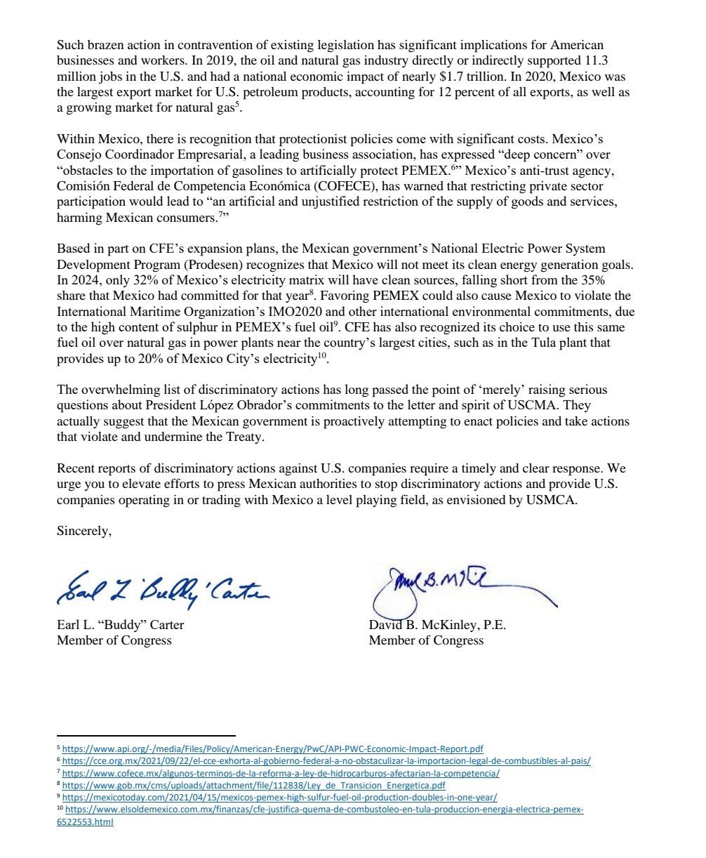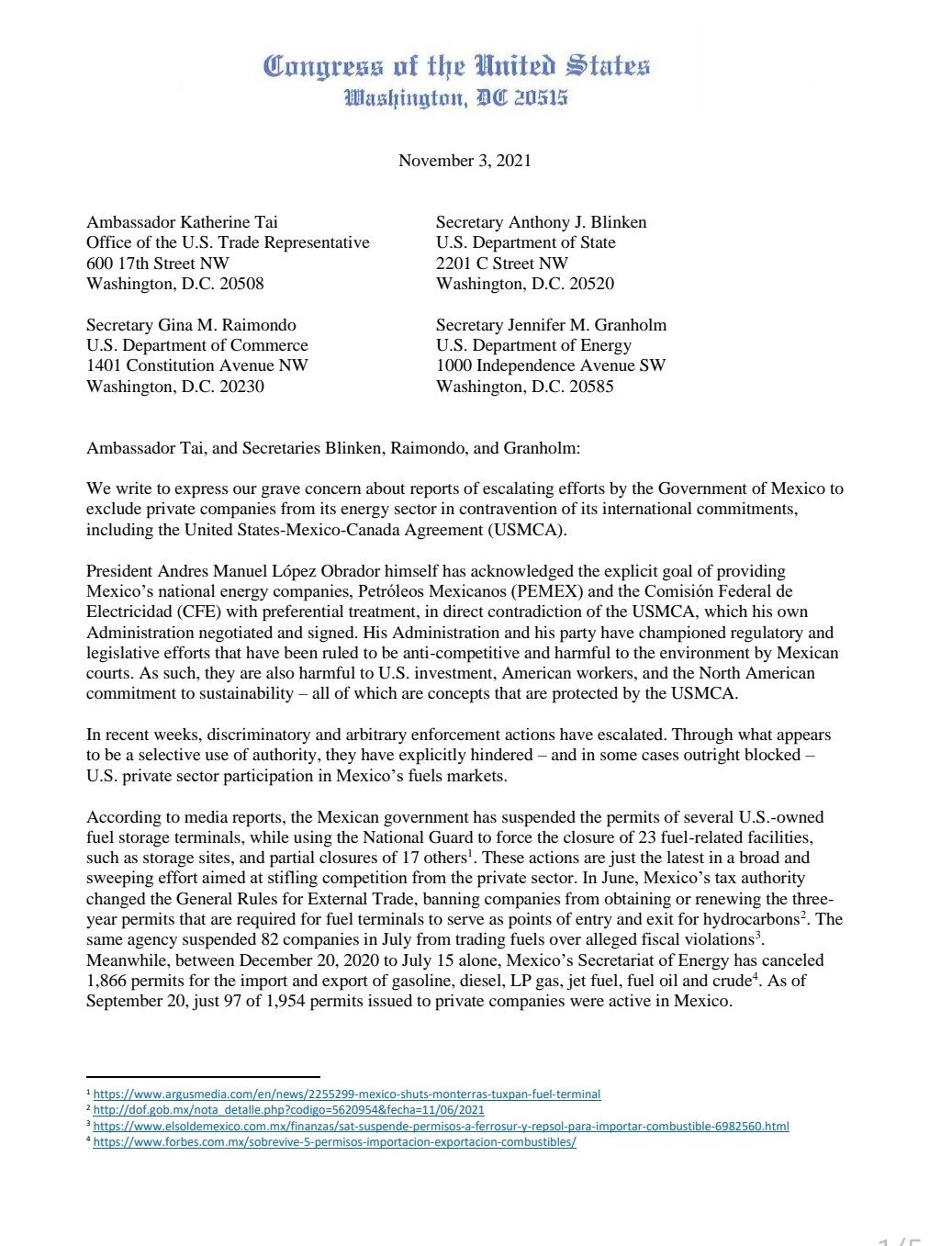 - Al mismo tiempo, decenas de congresistas enviaron una carta al presidente Joe Biden en la que le piden presionar al gobierno de AMLO para que se respete la participación de las compañías estadounidense en el sector energético, en apego al T-MEC.