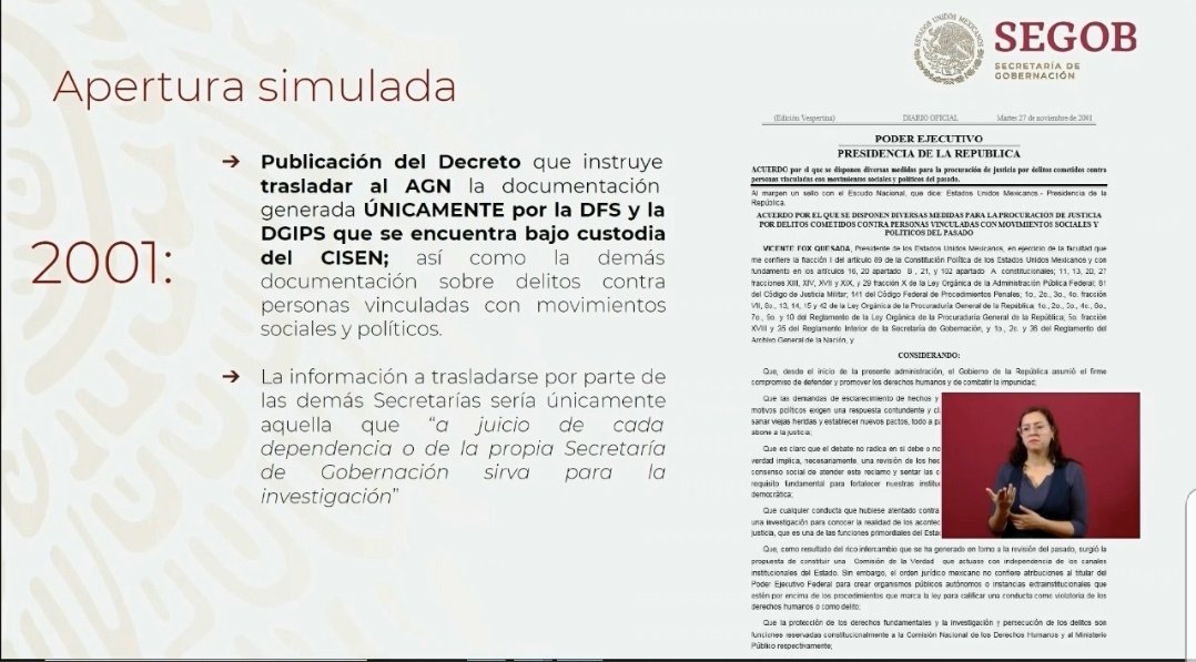 A su vez, el subsecretario de Gobernación, Zoé Robledo, refirió que el acuerdo publicado ayer instruye a todas las instituciones a entregar la información de 1985 a la fecha al Archivo General de la Nación, especialmente lo relacionado con derechos humanos, actos de corrupción, persecución política.