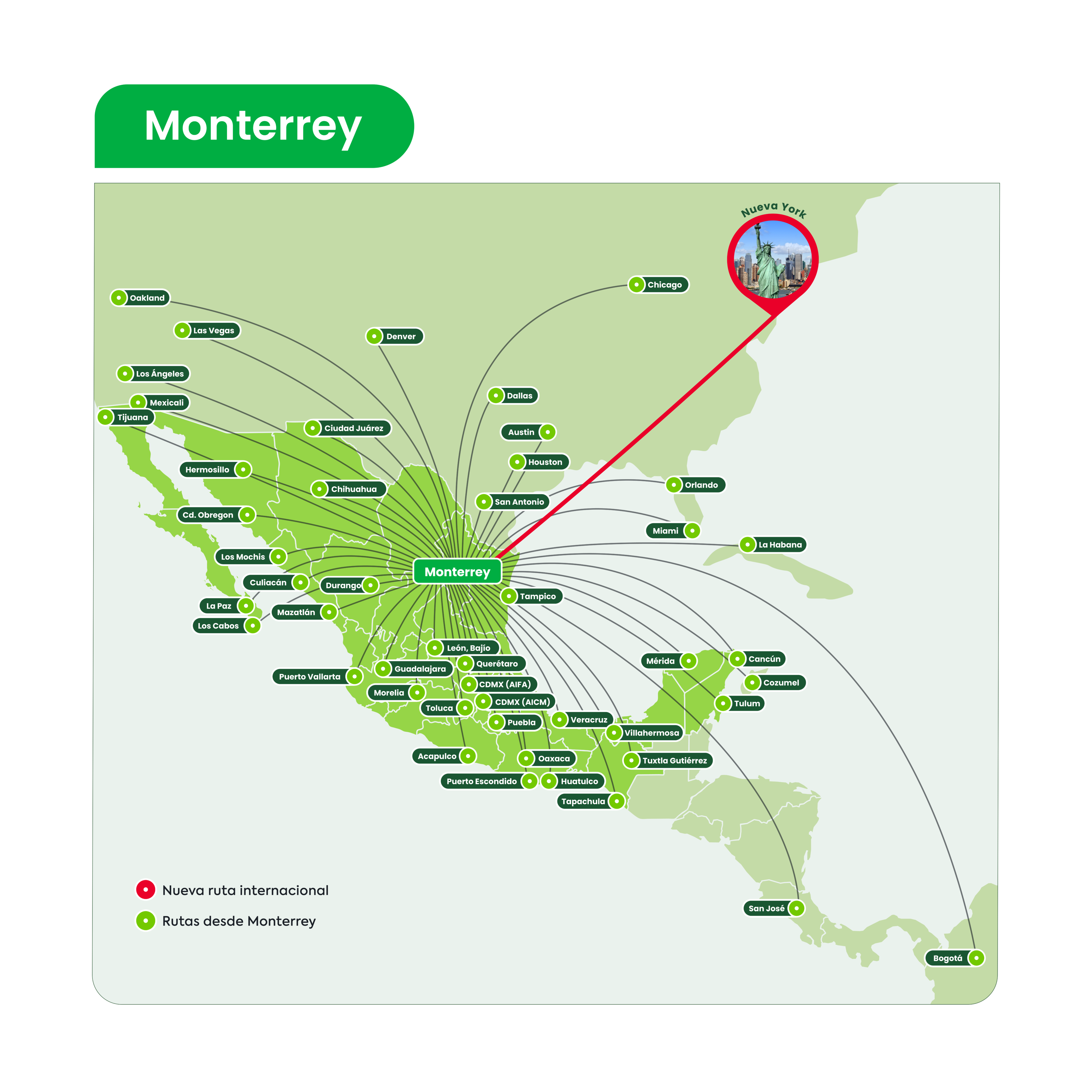 Viva anunció una nueva ruta directa Monterrey-Nueva York, conectando la capital de Nuevo León con una de las ciudades más visitadas del mundo. La aerolínea ofrecerá este servicio a partir del 13 de diciembre de 2025, con cuatro frecuencias semanales los lunes, martes, jueves y sábado, que se mantendrán hasta el 11 de enero de 2026. Posteriormente, el vuelo se ofrecerá de manera permanente a partir de junio de 2026, justo a tiempo para la Copa Mundial de Futbol.